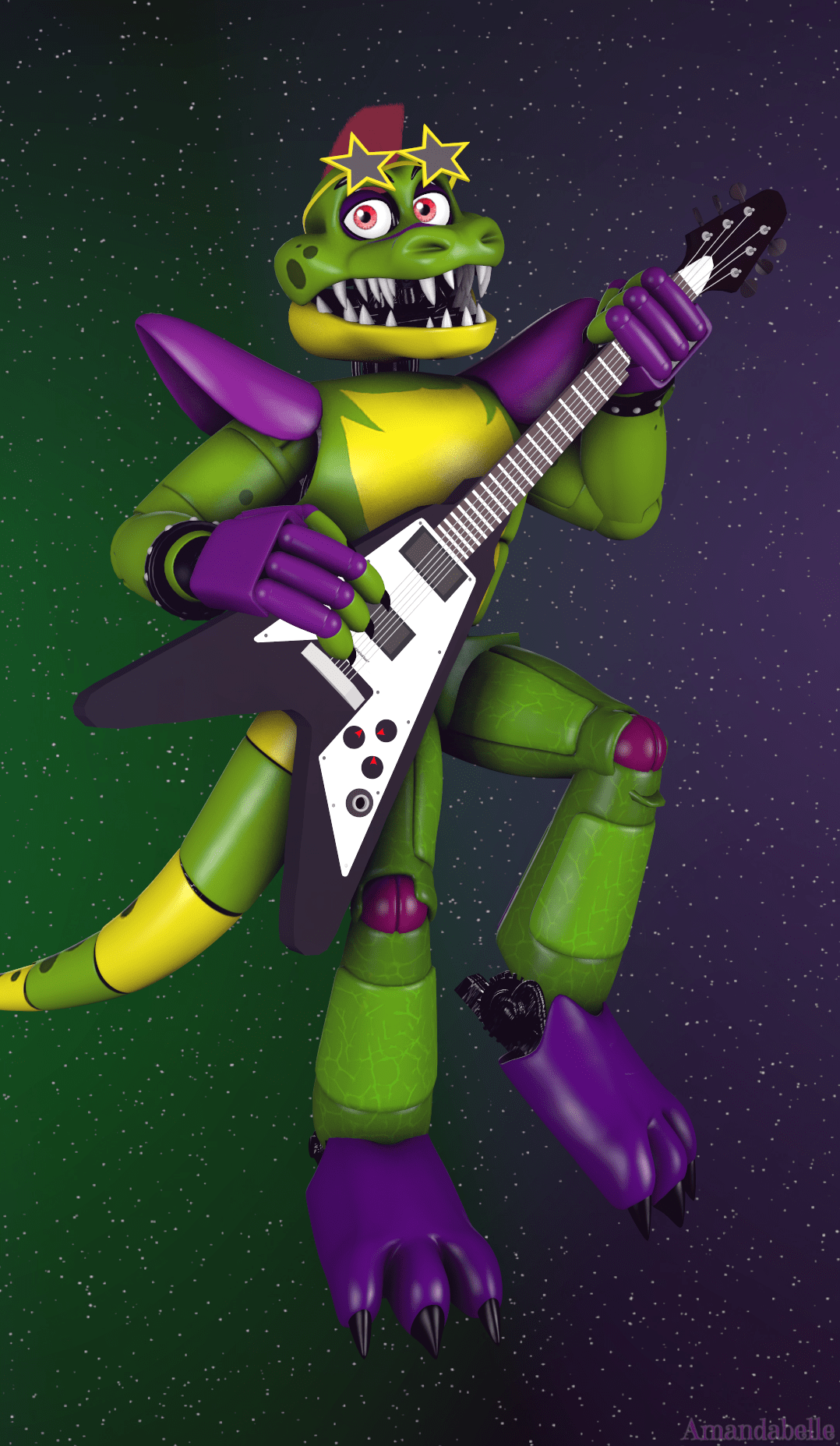 Montgomery Gator is an alligator animatronic with a punk rock aesthetic. He sports pointy teeth, black claws, a red mohawk, green scale-textured pants, spots on his arms and cheeks, a light yellow color for the belly, lower jaw.